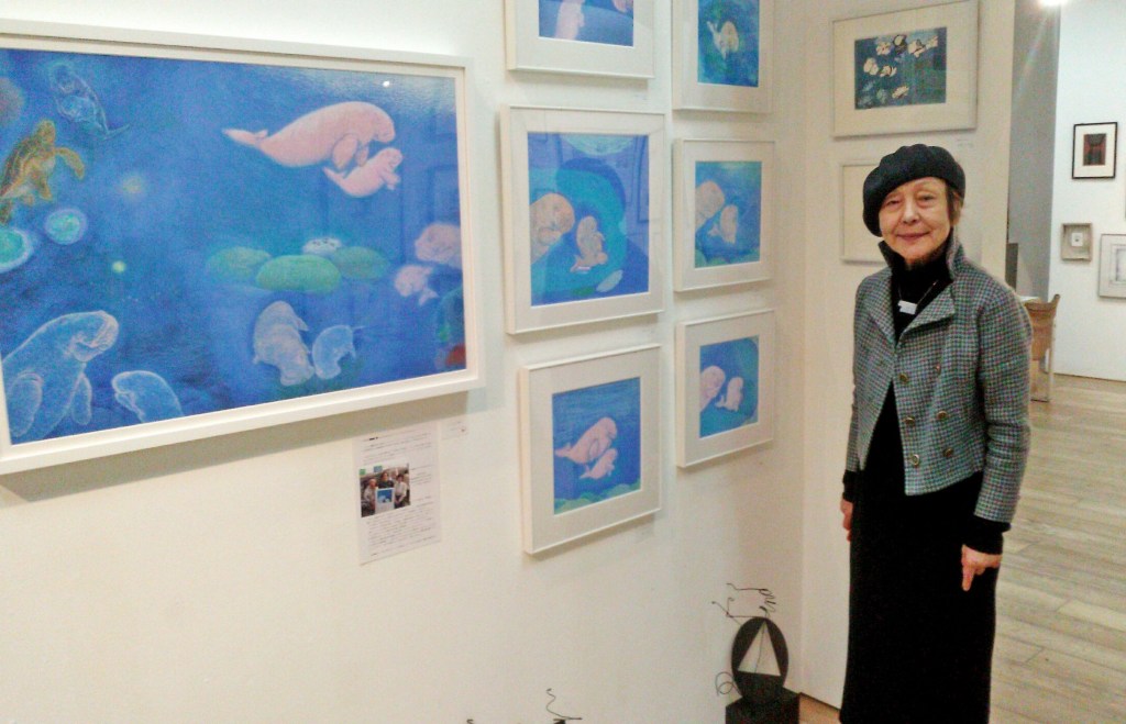 作家の灰谷健次郎さんの本の挿絵を手がけたりした画家・坪谷令子さんの「初期から今日までの作品」を選んだ個展が開かれた。美術科の卒業制作は、絵画の素養がない私にも、「若い躍動と憂愁」が伝わってきた。青い海を泳ぐジュゴンは大浦湾だろうか。坪谷さんの作品には、絵本『ヒロシマのピアノ』(共著)もある。(撮影:11月、神戸市内、mark)