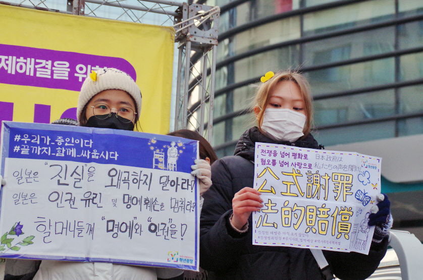 この日、極寒のソウルでは、第1630回目の水曜デモが開かれ、進行責任は学生グループ。若者たちがたくさん参加して歌い、踊り、スピーチ。最後に、「韓国政府は「2015日韓合意」を破棄し、日本政府に11・23勝訴判決の履行を要求せよ!/日本政府は戦争犯罪を認定し、公式謝罪と法的賠償を行なえ!/学生が先頭に立って日本軍性奴隷制問題を解決しよう」とよびかけました。(新田蕗子)