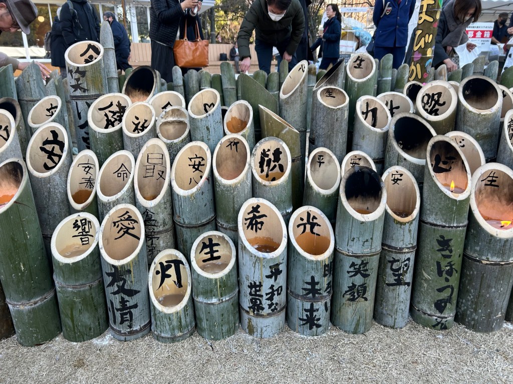 東遊園地(神戸市)、追悼の灯籠。1995年1月17日未明。M7・3、最大震度7。死者6434人(不明3人)。負傷43792人、全半壊24万9千棟。学校、公園など避難所から仮設住宅へ、復興住宅からの追い出し。毎年開かれる市役所前「追悼・連帯・抗議」の集い。29年目、能登大震災へ支援、連帯の声が…。(撮影:1月17日午前、庄)