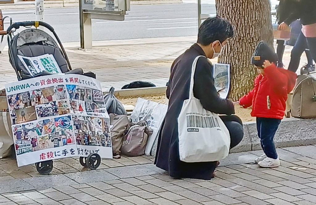 「この4カ月で1万5千人の子どもが殺されています」とAさんは呼びかける。「パレスチナを知るキーワード」というチラシを配ったり、パレスチナの旗を振ったり、手作りのボードを掲げて静かに立っていたり、若い女性の「Free Free Palestine!」のコールに声を合わせたり、2カ月の赤ちゃんのお母さんは、途中、ミルクを呑ませ、それがすむと抱っこしてチラシ配り。一人ひとりが自分のスタイルで自分の意志を示していた。