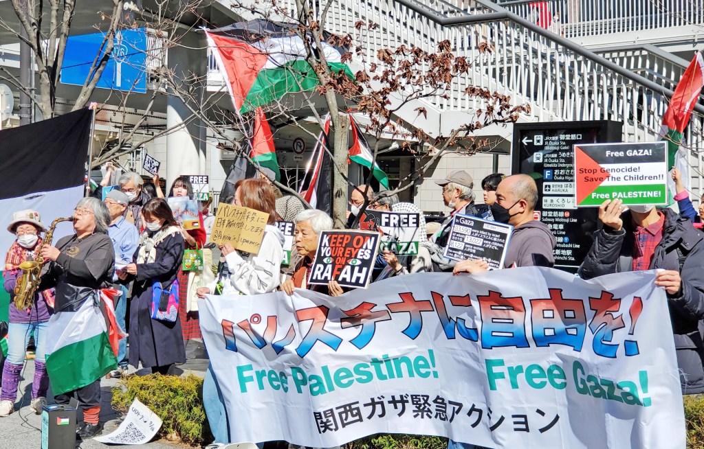 JR大阪駅前では関西ガザ緊急アクションの呼びかけで300人が集まり、抗議のスタンディングとアピールが行われた。「デモに参加するのは今回が初めて」という人たちの発言も多かった。「生まれた場所が違うだけで夢も見られない、明日の命も分からない子どもたちがたくさんいることを想像してほしい」「普通の市民が殺されているのだから、普通の市民が助けなければならない」「一人一人が行動することが、状況を変える力になると信じている」と口々に訴えた。