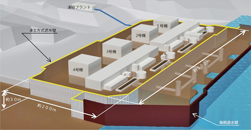 地下水位を下げる方策の基本的な考え方。「アルプス処理」が行われているが、トリチウム水の海洋放出は、できれば避けたい。地下水のデブリへの接触を断つ必要がある。コンクリートの地中連続壁で原発を囲い、地下水をデブリから十分に下げる。その「囲い込み」は、いまの建築技術ならできる。