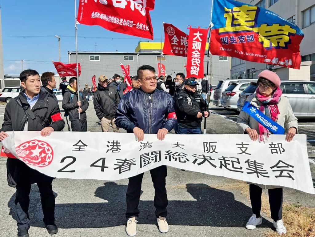 全港湾大阪支部の24春闘総決起集会が行われた(3月3日、大阪市内 写真上)。小林勝彦・大阪支部委員長は、「24春闘は、戦争と物価高騰のなかでの取り組みだ。物価高騰が生活を苦しめている。そこを突破したい。世界では戦争が行われ、それを口実に憲法9条の戦争をしないという決意が政府与党によって踏みにじられようとしている。琉球弧の島々への自衛隊の配備の動きを大阪でも実感できる。全港湾は、戦争協力の反省から『戦争をしない、させない』決意で結成された。戦争になれば未来はない」と発言。続いて全港湾関西地方本部が「①企業の膨大な利益を労働者に還元させる②合理化・人減らしを許さない③各企業との協定を履行させる。④沖縄はじめ港湾を軍事利用させないの4つの柱で闘う」と決意表明。