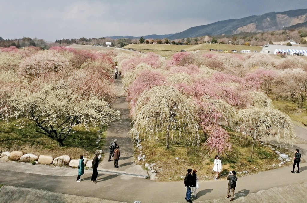 三重県いなべ梅林公園。38ヘクタールの広大な庭園に広がる花梅、実梅の白やピンクの花霞は絶景そのもの。約100種4500本の梅林である。毎年2月から3月に開催される「梅まつり」には、多くの人が訪れる。近鉄桑名駅→三岐鉄道・西桑名駅→北勢線・阿下喜駅から。(撮影:3月、ヒロ)