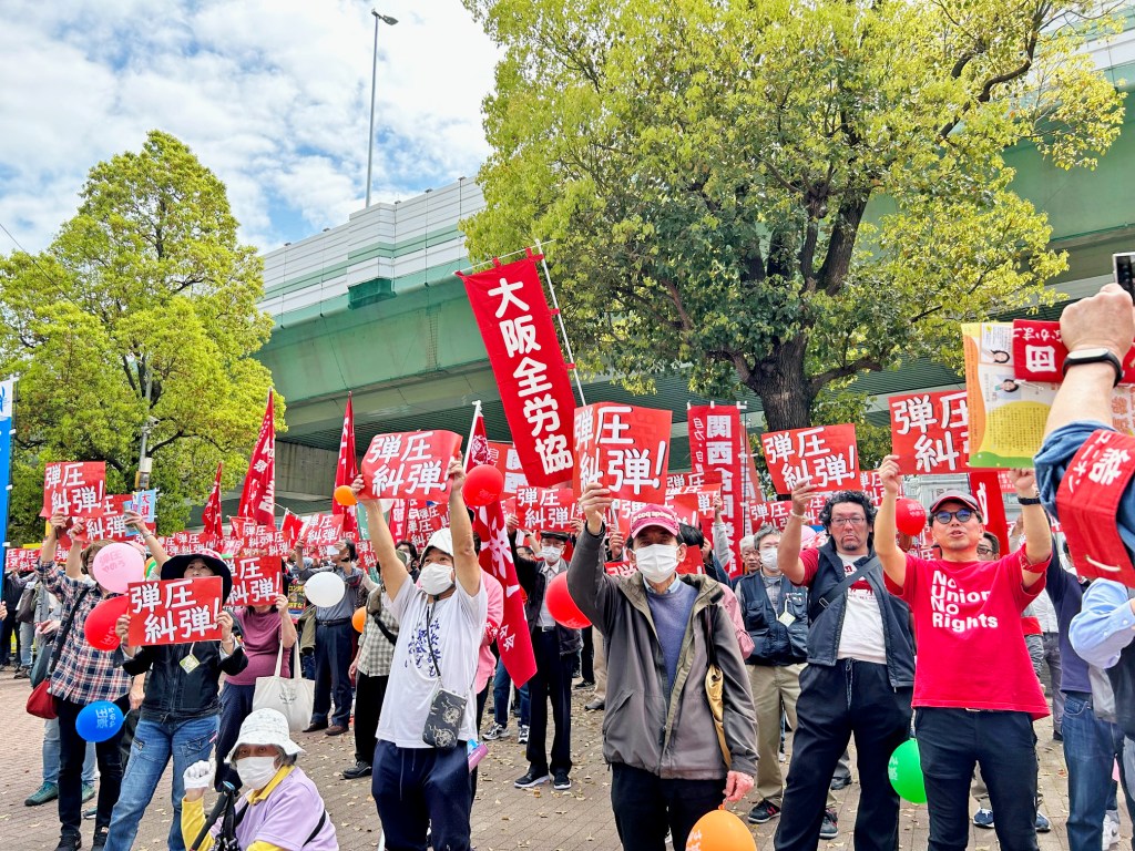 大阪地裁前で開かれた大阪集会には430人が参加。「労働組合つぶしを許さない実行委員会」代表、小林勝彦さんがあいさつ。「(関西生コン事件の裁判では)各地裁でいろんな判決が出ているが、大阪高裁での闘いが重要だ。危機意識をもって取り組みたい。大津地裁でビラまき活動が無罪になった。毎日放送でも関生支部が取り上げられた。大阪広域協組の不正義性が明らかになっており、労働運動の正当性をもっと押し出していく必要がある。一人ひとりの力が大切だ」と話した。