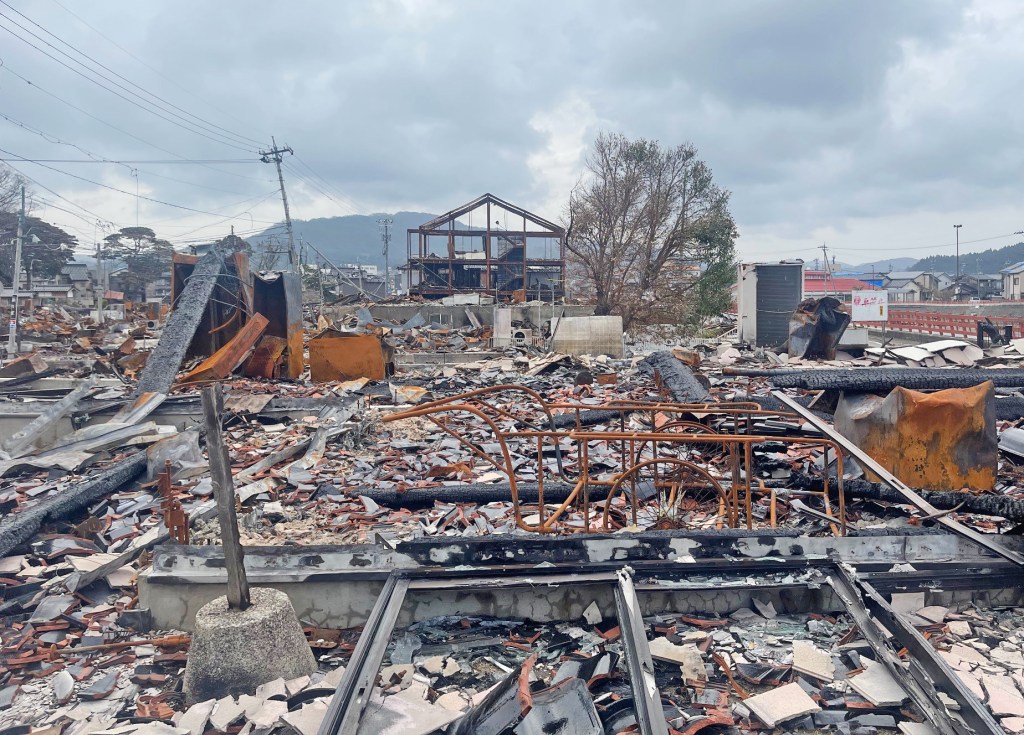 輪島市へつながる能登里山街道は、被災から3カ月経過しても、輪島市に向かう途中から「行き一方通行」に規制され、しかも至る所が土砂崩れ、夜の走行は非常に危険な状態でした。輪島市では一部仮設住宅の建設は始まっているものの、全体数が不足。さらに驚きは、大火災に見舞われた輪島市河井町です。焼けた住宅ビルはもちろん路上に焼けた自動車、電線にもたれる電柱も放置状態で、解体撤去などがまったく進んでいない状況でした。