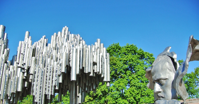 「フィンランディア」はフィンランドの作曲家ジャン・シベリウスによって作曲された交響詩、帝政ロシアに対する独立運動を象徴する曲である。当時の帝政ロシア政府は、これを演奏禁止処分にした。歌詞がない器楽曲が政治処分を受けるのは、極めて異例だ。曲の解説だけでなく、帝政ロシア~第一次世界大戦~ロシア革命~第二次世界大戦~独ソ戦…と、それがフィンランドの人びとから慕われてきた歴史的背景も解説している。写真の右側はシベリウスの肖像。(太郎)