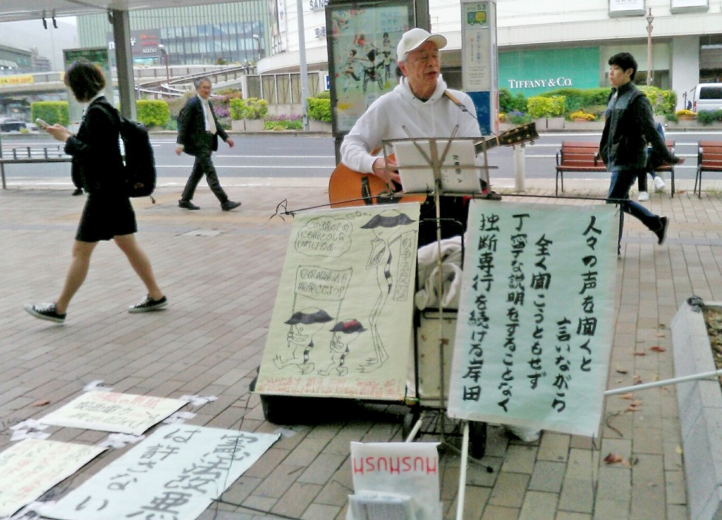 ときどき街で歌う、ストリートミュージシャンの平田さん。デモのときも、ギター持参で参加している。私は歌がさっぱり。中学校のとき「まじめにやっているのに」…音楽の先生に「音楽を舐めとるんかっ」と怒られた。平田さんは、「戦さ しらずに二十歳になって…」という、優しい歌をいつも歌う。(撮影:4月 神戸市内、mark)
