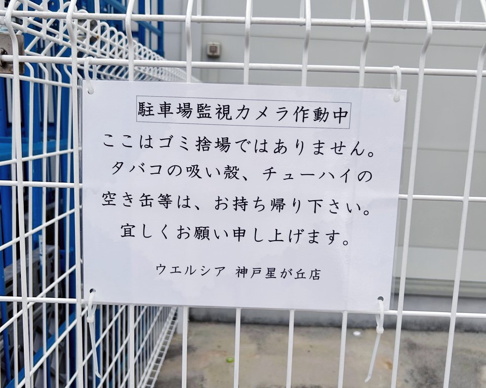 やさしい「警告文」。仕事でよく立ち寄る24時間営業のドラッグストアの駐車場に貼ってある。たいていの場合、「警告」「めいわく」「警察に通報」などの強い言葉が並ぶものだが、「タバコやチューハイの缶を捨てないでね」というやさしい言葉に、ほっとする。(撮影:5月 神戸市内、太郎)