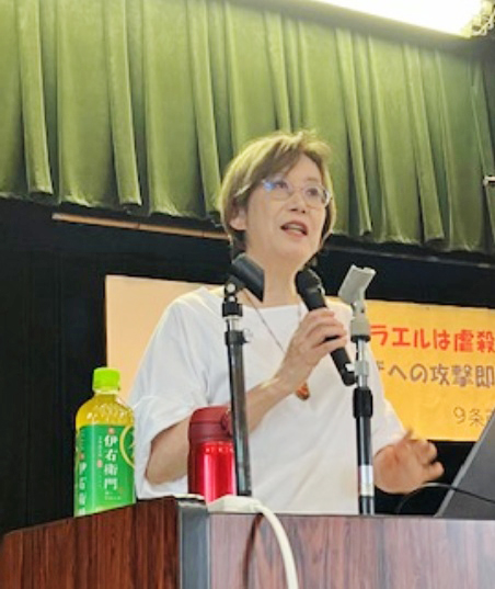 講演に続いて、京都在住のパレスチナの女性が発言。「私たちは皆さんと同じ人間であり、数ではありません。夢も喜びも同じなのに、生命を守る抵抗闘争にたいする理解が十分でないのが悲しい。驚くほどたくさんの子どもたちが命と未来を奪われている現実を変えるために、ともに闘ってほしい」と訴えた。(多賀)