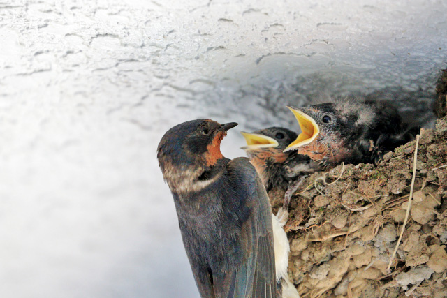 スロー撮影で親ツバメが子ツバメに餌を与えている様子が見られます。枝に止まっている子ツバメに親が飛びながら餌を与えています。