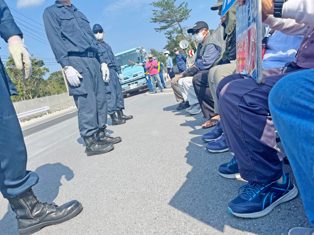 3泊4日の短い沖縄滞在だったが、どこへ行っても人手が足りないのを感じた。キャンプシュワブの新しい工事用ゲート(写真上)は、これまでの座り込み場所から格段に遠くなり、高齢者が自力で旧ゲート前テントと往復するには、苦労する距離だ。日によって座り込みの人数に多寡はあるが、朝9時のダンプ搬入のときに雨が降ったりすると、少ない時には一桁に。機動隊も、何だか拍子抜けしているかも。