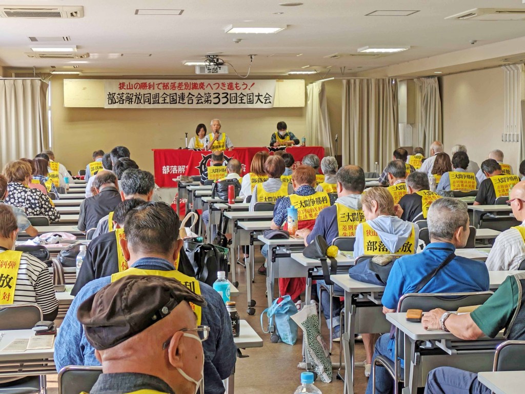 部落解放同盟全国連合会の第33回大会が開かれた(6月16日、大東市民会館、写真)。村上久義委員長が開会あいさつ。「アメリカ帝国主義がウクライナ戦争や中東ガザへのイスラエルによる侵略戦争に関わり、世界戦争への道を突き進んでいる。そのアメリカに、グローバルなパートナーシップとして岸田政権が追随している。とんでもないことだ。アメリカの学生が『イスラエルの支えになるな』と声を上げ、日本の学生も決起した。戦争断固反対に立ち上がろう。沖縄の闘争はうるま基地建設を阻止し、辺野古の新基地建設反対闘争が行われている。全世界の人びとと連帯し闘うことは部落解放を掲げる私たちの使命だ。石川一雄さんの再審闘争を何としても勝ちとろう。袴田巌さん再審は結審し、9月22日に判断が下される。次は狭山だ。6月11日の三者協議で検察は、『鑑定尋問は必要ない』と言った。検察の強さではなく追い詰められているということ。7月の三者協議を最後に8月以降に判断が下される。石川さんを『犯人』とするため万年筆をねつ造したことを、立証する必要がある。万年筆を100本集め実験し立証しよう。狭山闘争の勝利を通し、部落解放を勝ちとろう」と訴えた。