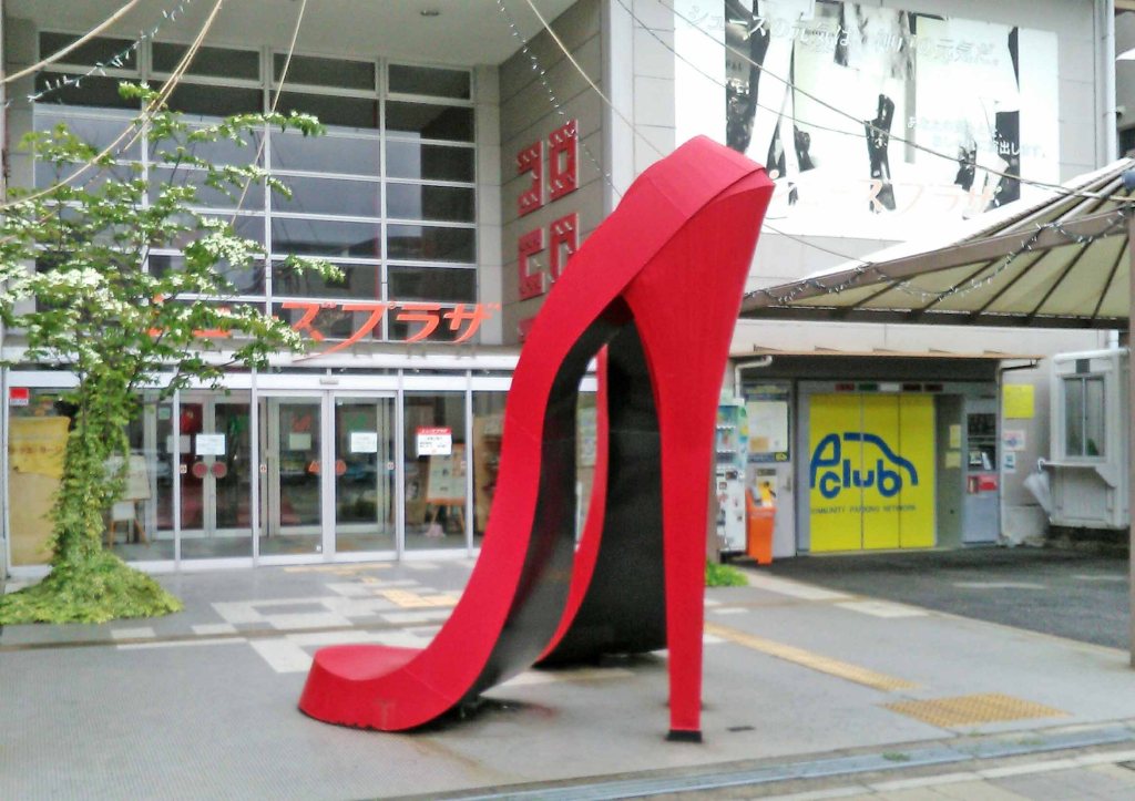 「ケミカルシューズのまち」長田(神戸市)、大震災の被害の後にできた展示・ショッピングセンター。靴のデザイン体験もできる。前庭に2階まで届く真っ赤な靴のモニュメントがある。いまどきこんなピンヒールを履く人はいないだろうけど…。4階には神戸アジア交流プラザ、資料などが常時展示されている。(撮影:5月、mark)