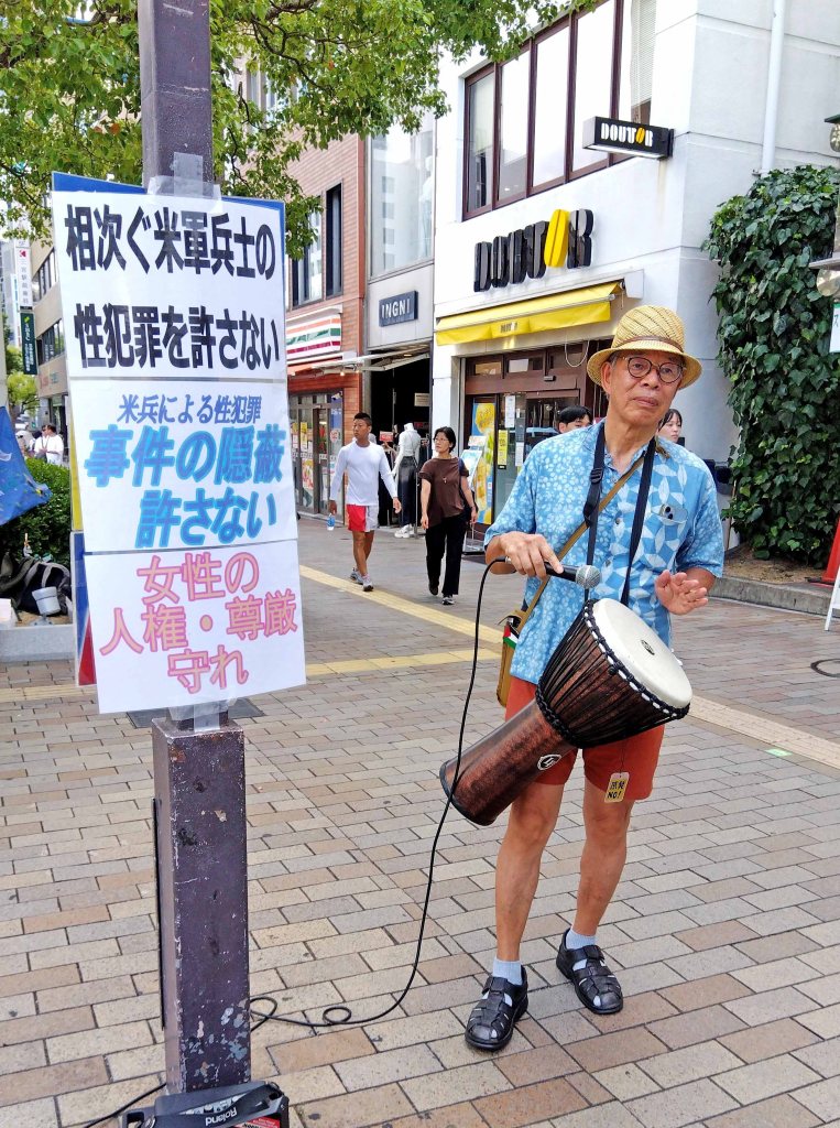 8月17日(土) この日も気温35度、熱中症警戒アラート。ジャンベ(太鼓)で参加の人、心地よい、強い響き。スピーチのあと激しく叩きアピール(写真)。「沖縄の米軍基地被害。日米地位協定でアメリカの言いなりになっているからだ。本土でも同じ」と、「沖縄を返えせ」を高らかに唄った。「自衛隊を災害救助隊に、話し合いで平和を」「誰もが共に生きて行ける社会を」「琉球孤の島々がアメリカの防波堤になっている」「ポツダム宣言に天皇制が保証されていないことから、それを黙殺したために広島、長崎に原爆が投下された」とそれぞれアピール。三線を習っているという中年女性が署名。「ここで弾いてください」とお願い。チラシを受け取った女性がすぐに署名、「頑張ってください」と 励まされた。岡山県の中年男性、「沖縄は大変です。頑張ってください」。この行動は2014年から毎週(土)、年中無休、この日で508回。どなたでも参加歓迎です。(なかい)