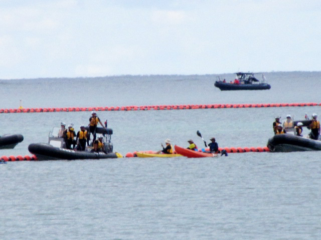 カヌーチームは5名ごとに班分けされ、さらに安全のため2人でバディー(仲間、2人組)を組んでいた。バディーの1人がカヌーから飛び込んで阻止行動に移ると、もう一人が飛び込んだカヌーを確保する役目を果たす。73歳のカヌーのメンバーが果敢に飛び込む。続いて若い女性メンバーも作業ロープに取りつく。たまりかねた作業船がいったん退くと、カヌーチームは近くの長島か平島で昼食を取り、休憩し監視を続ける。