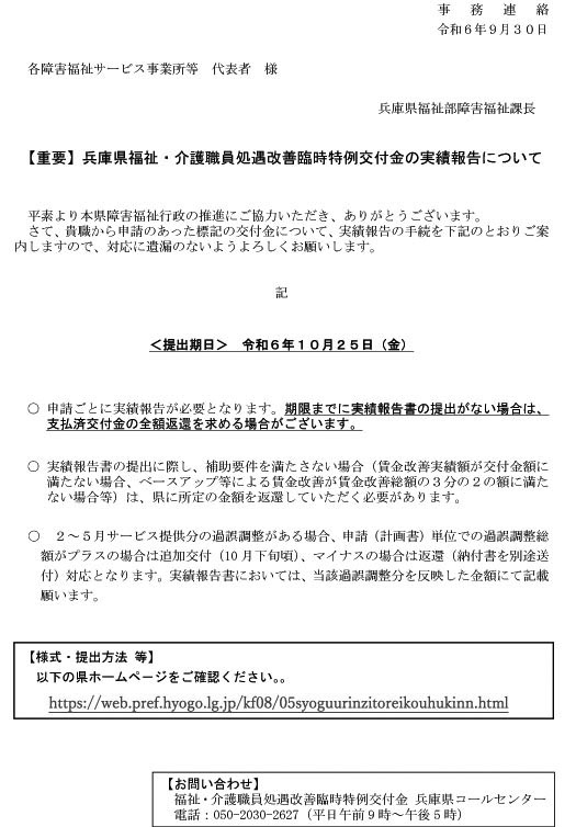 話はこれで終わらない。10月になって兵庫県から「交付金の内訳について報告書類を提出するよう」と通達(左)がきた。会社の管理者はぶち切れている。県は事業所から申請書を審査した上で交付金を支給しており、データとして各事業所の交付金の内訳を持っているのに、「改めて報告せよ」と言ってきたのだ。二度手間というより、ほとんど嫌がらせである。