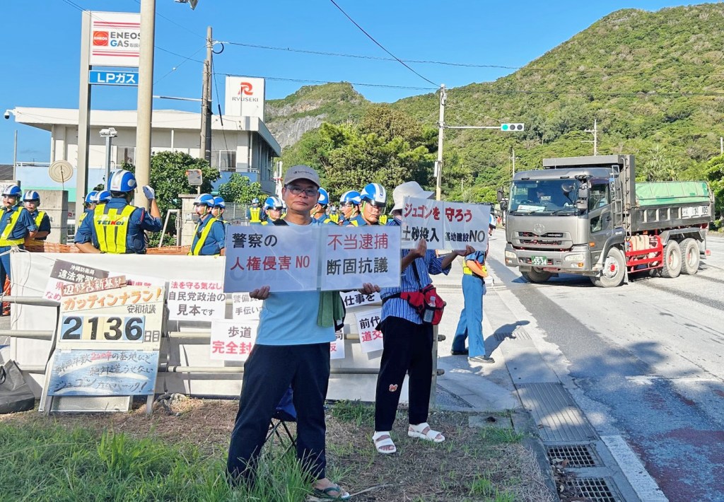 9月26日には、つえをついて抗議に参加していた男性が不当逮捕された。「防衛局職員の胸を両手で押して転倒させた」という。デッチ上げだ。一緒に抗議していた市民は「彼は足が悪く、つえをついていた。防衛局職員とは、手を伸ばしても届かないくらい離れていた。彼が押したり引いたりできるはずがない」と証言している。男性は29日に釈放された。