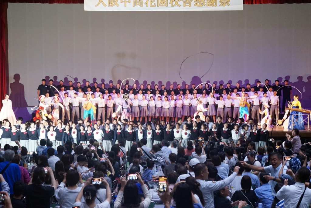 来年度から新校舎(大阪市東成区中本東)に移転するため、花園校舎での最後のイベント。在校生、卒業生、オモニ・アボジ・ハルモニ・ハラボジ、地域同胞、日本人支援者などで会場は満杯。 オープニングは歌とダンス。校長先生のあいさつ、中3・高3生の語りと歌があり、中高教員の合唱と続く。そして、乾杯のときにサプライズゲストが登場。ラグビー日本代表で活躍している李承信(リスンシン)さんだ。ひときわ大きな歓声が上がる。そして大阪朝鮮学校出身者の金剛山歌劇団員による公演。70年の学校をめぐる歴史が映像で紹介され、その時々の詩を朗読。最後に、全生徒がステージに登壇し校歌を大合唱。