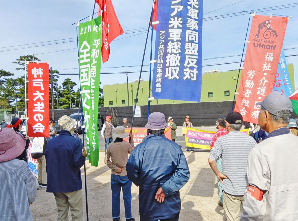 大型バス1台で参加した「米軍Xバンドレーダー基地反対・京都連絡会」は、フェスタの開始に先立って、米軍経ヶ岬通信所前で抗議行動(写真)。この行動には、京丹後市会議員の永井友昭さんや、京都祝園弾薬庫問題を考える住民ネットワーク共同代表の呉羽真弓さんらが合流し、合わせて50人で取り組まれた。