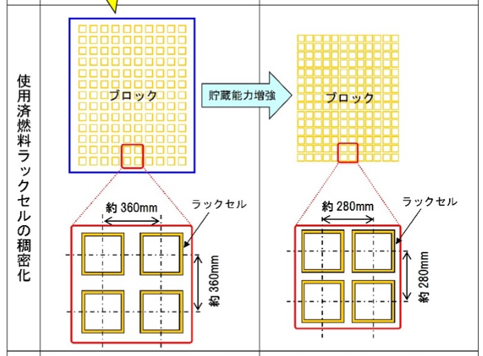 これは「リラッキング」と呼ばれる工事(図参照)で、20年に着工していた。収容できる燃料は1050体から1672体に増えた。11月末時点で978体を保管している。