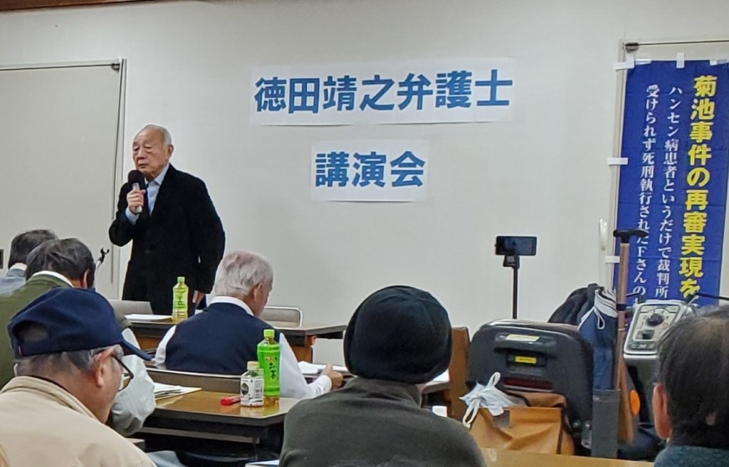 80歳を超える徳田弁護士は、文字通り命をかけ菊池事件の再審実現のためたたかっています。「全国どこへでも講演に行く」とも。私たちの、ささやかな講演会が契機になり、各地で勉強会が開かれ運動が広がり、再審が実現し、なりよりも冤罪で死刑に処せられたFさんと、ご遺族の名誉が回復されることを望みます。