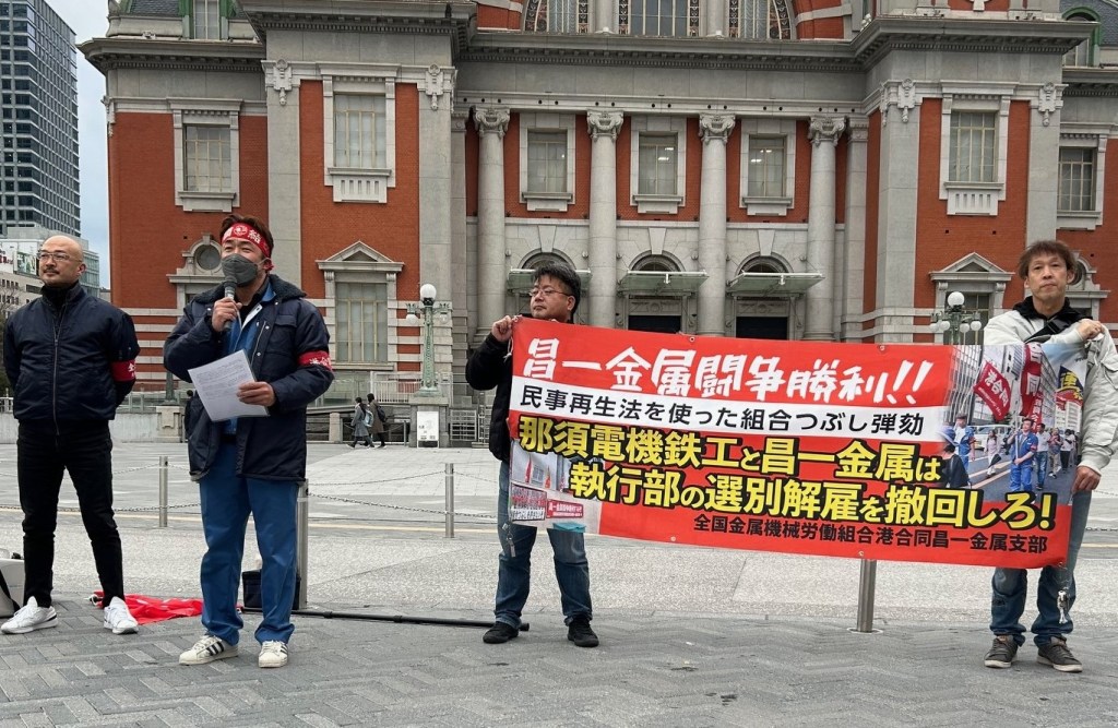「昌一金属が民事再生法を申請してから、ちょうど1年。この事態は、私たちにとっては寝耳に水。昌一金属は那須電機鉄工に事業譲渡をするにあたって組合に対し、これがまとまらなかったら破産になる、雇用が失われると、わずかな解決金で屈服を迫ってきました。私たちが組合の原則を守ってたたかうなか、組合事務所の明け渡し攻撃をかけてきました。この件を含め、3つの大阪地裁、労働委員会でたたかっています。大阪地裁は、会社側にたち、事務所の明け渡しと解決金による終結を迫ってきました。私たちがこれを拒否すると、会社は裁判に訴え事務所明け渡しの仮処分を強行してきました。