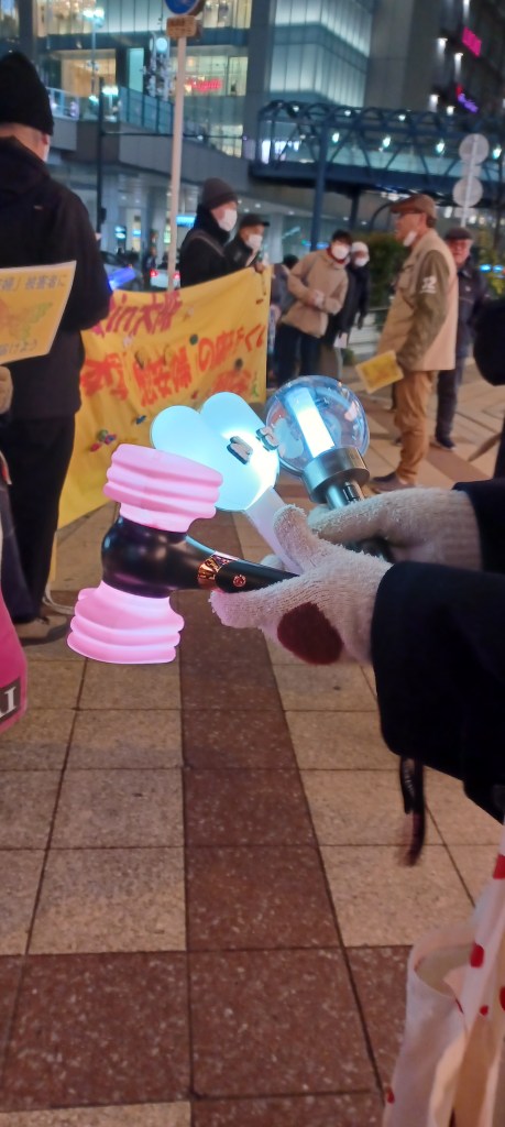 1月8日、第220回の「慰安婦」問題の解決を!大阪水曜デモに、韓国のユン・ソンニョル弾劾デモで注目されているK‐POPファンの応援棒が登場しました。