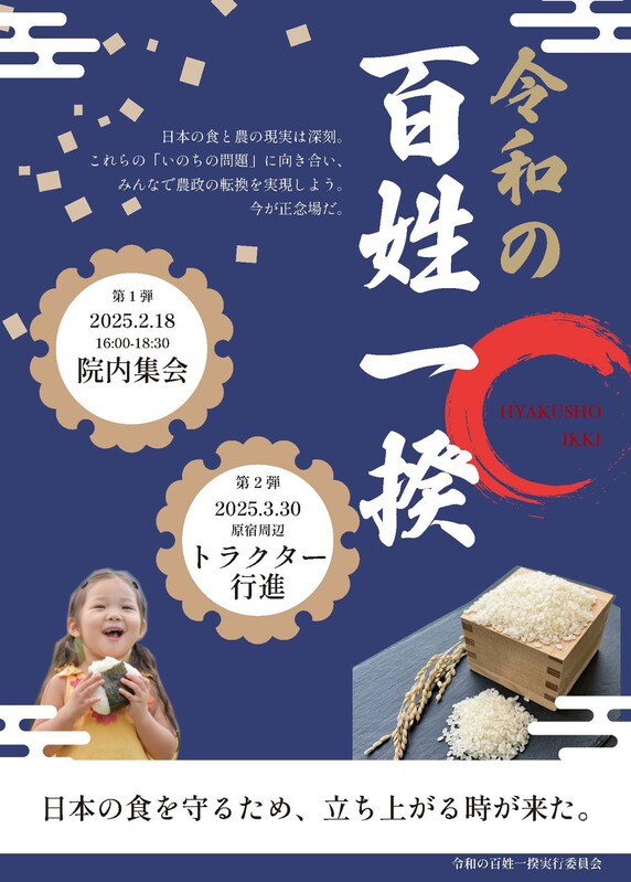 コメの増産は緊急の課題である。稲作農家への所得補償もそうだ。3月30日、「令和の百姓一揆」を掲げた都内の行動に4500人が参加した。トラクター31台を連ね、「欧米並みの所得補償を!」と国に求めるデモは壮観だった。
