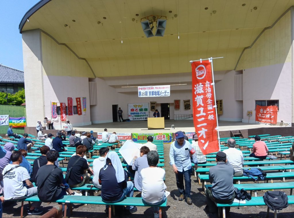 5月1日、晴れわたる青空の下、円山野外音楽堂(京都市東山区)で2025京都地域メーデーが開催された。参加者は120人。司会は中金労組。憲法9条京都の会、パレスチナの平和を求める会・京都、在日本朝鮮留学生同盟京都地方本部が連帯のアピール。日比谷メーデー実行委、大阪中之島メーデー実行委、AWC韓国員会からの連帯メッセージが紹介された。