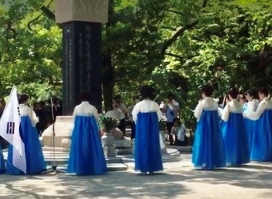 慰霊碑は、亀の像の上に建っている。混雑を避けてか、毎年8月5日に碑前で慰霊祭が営まれる。在日の知人に「なぜ、亀の背中に置かれているのか」聞いた。「韓国では死者は亀の背中に乗って来世に向かう」という言い伝えがあるということだった。亀は朝鮮半島の方を向いている。(つづく)