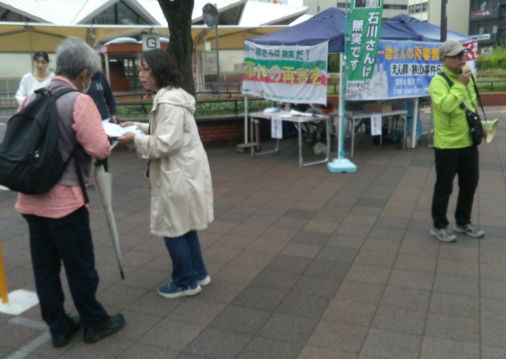 座り込みの17日は、朝あいにくの雨だったが、雨が上がるとチラシ配布、署名、マイクを持ってアピールした。狭山再審弁護団は、第3次再審請求審を引き継いで「逮捕当時に石川さんが書いた上申書」「警察での取調べが録音されたテープ」「コンピュータによる筆跡鑑定」「万年筆のインクが被害者のものではないとする科学鑑定」などを裁判所に提出、事実調べ、鑑定人の尋問を求めている。