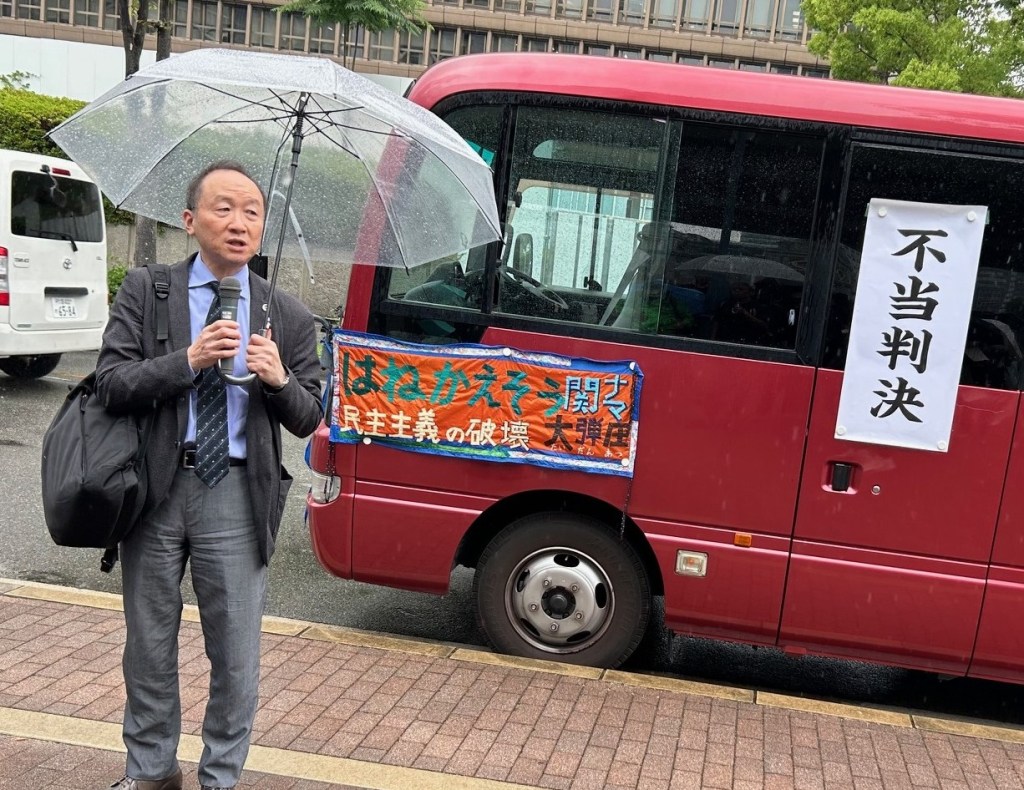 事案は、フジタ、日本建設、東横イン電建の工事現場で行なわれたコンプライアンス活動(注1)とビラまき行動を「恐喝未遂、威力業務妨害」としたもの。一審の大津地裁判決(2024年2月26日)は、組合員1名に懲役2年6カ月、もう1名に懲役1年6カ月、執行猶予3年というものだった。