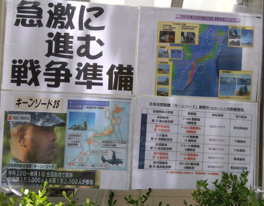 スピーチでは「沖縄から基地をなくそう」と訴え、『沖縄今こそ立ち上がろう』と歌いました。ギターでは、いつものように熱奏、熱唱。「いつまでも俺たちを、舐めてるんじゃないぜ!」と気勢を上げ、「普通の市民の力で戦争を止めよう」と訴えました。乳母車に赤ん坊を乗せた母親が、チラシを受けとり「署名もします。資料も読みます」と話していました。