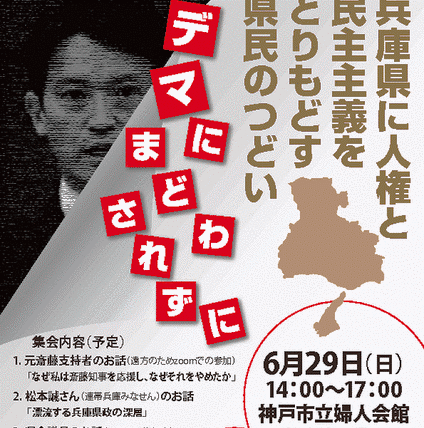 「兵庫県に人権と民主主義を取り戻す県民のつどい」が開かれた(呼びかけ:県知事選を振り返る市民の会、6月29日、神戸市内)。