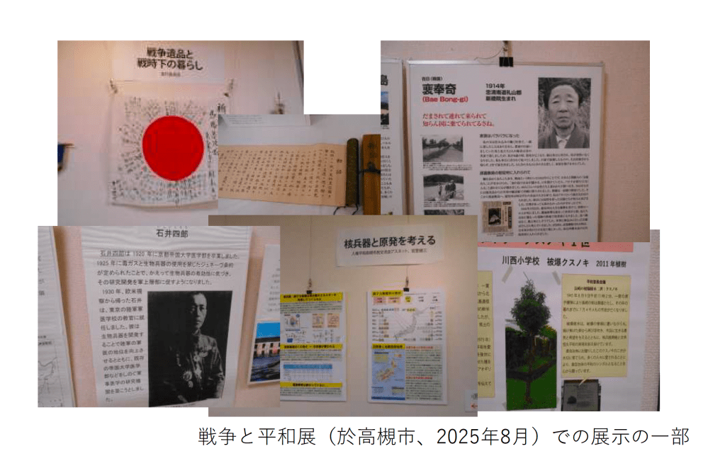 今回は、15のテーマに沿って展示がおこなわれていました。731部隊、沖縄戦の悲劇、日本軍軍隊慰安婦、タチソ(高槻地下倉庫)、戦争遺品、戦争プロパガンダなどです。長年それぞれの課題を取り組んできた市民グループの活動がコンパクトに展示されており、わかりやすい説明もあって、あらためて旧日本軍の戦争犯罪・植民地支配の残虐性を痛感しました。また、展示されている戦争遺品の中には、私の地元の知人が拠出した展示品もあり、80年をへた今でも、戦争自体が身近な関係の中で継続していることを実感しました。