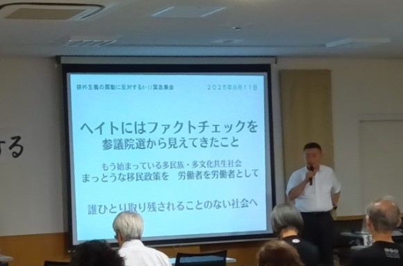 7月の参議院選挙を前に、外国人、難民、民族的マイノリティー等の人権問題に取り組むNGO諸団体が共同で、「排外主義の扇動に反対する緊急声明」(賛同団体1159団体)を発表した。この緊急声明を呼びかけた、移住者と連帯する全国ネットワーク(移住連)共同代表の鳥井一平さんが京都市内で講演を行った(8月11日)。