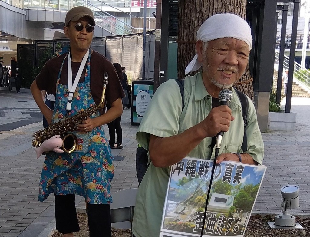 ギターやジャンベを鳴らしながら「米軍基地は、さらば」「琉球諸島の人々は捨て石にされる」「トランプが戦争省と言っている。ノーと声をあげなければ」「対馬丸の悲劇を忘れない」「沖縄に基地は一切いらない」と、それぞれ訴えた。