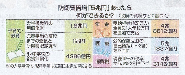 「5兆円あったら、何ができるか」という試算がある。大学授業料の無償化には1・8兆円、公的保険医療負担ゼロは4・8兆円、消費税2%引き下げには4・3兆円でできる。