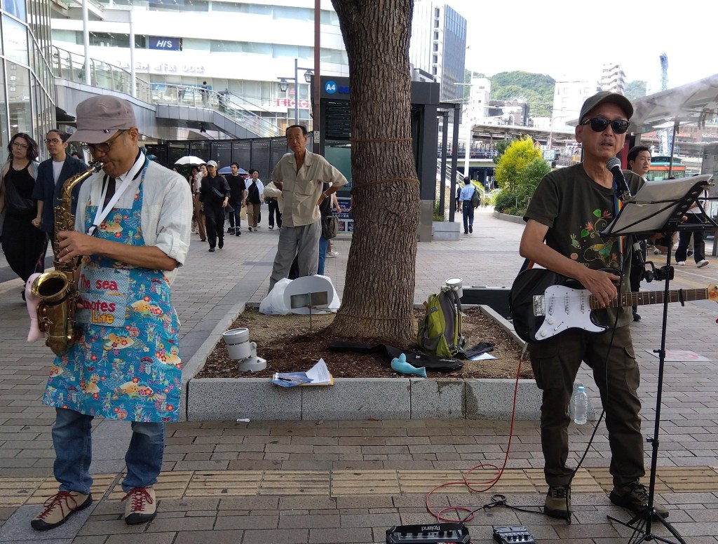 ギターサックスのコラボで賑やか。サックスは、身体をよじっての熱奏でした。スピーチでは、映画『宝島』の感想を述べた後、「沖縄は昔も今も厳しい状況は変わっていない。それを本土の人間がどれほど知っているのか。日本人にとって沖縄は何なのか、と厳しく訴えました。