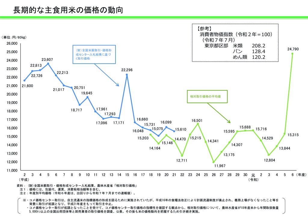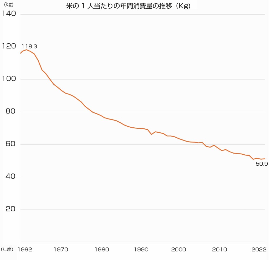生産調整を通じて米価の乱高下はおおむね避けられたものの、米価の長期下落基調はまったく変わらなかった。1995年でまだ980万トンあったコメの需要量は24年に711万トンまで減少している。一人当たりコメ消費量も1962年の118kgをピークに、22年には50.9kgまで減った。コメの供給過多という基調を受けて米価は下落を続けた。90年代には60キロ2万2000円を前後していた米価が、21世紀に入ると1万4000円くらいまで値を下げている。