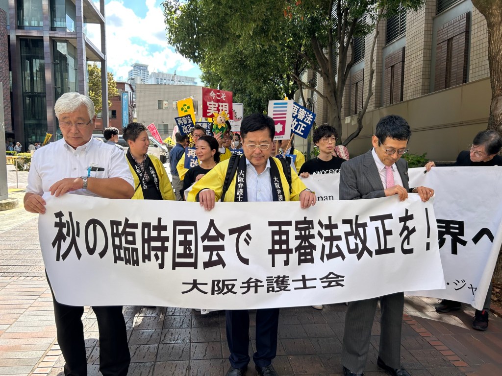 その後、「再審法改正」「今こそ実現」のポテッカーを手に、大阪市内をパレードした。終わりに、鴨志田祐美弁護士(日弁連再審法改正推進室長)が、「再審法改正にむかって大きな山場、勝負どころを迎えている。今までにない大きなうねりを感じている。秋の臨時国会で、ぜひ実現させたい」とまとめた。