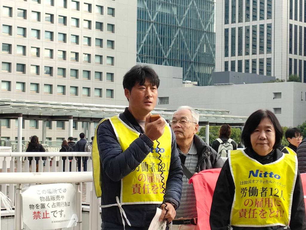 親会社の日東電工による偽装倒産・不当解雇の「使用者責任」を立証し、日東電工に団体交渉を求め闘争中である。チェ・ヒョンファン委員長が証人席にたち、「韓国オプティカルが撤収する際、一切の権限は日東電工の首脳陣にあったこと」「植民地解放後、日本のグローバル資本が韓国で操業し、工場を撤収する際の大量首切り」などの酷い実態を厳しく弾劾する証言となった。