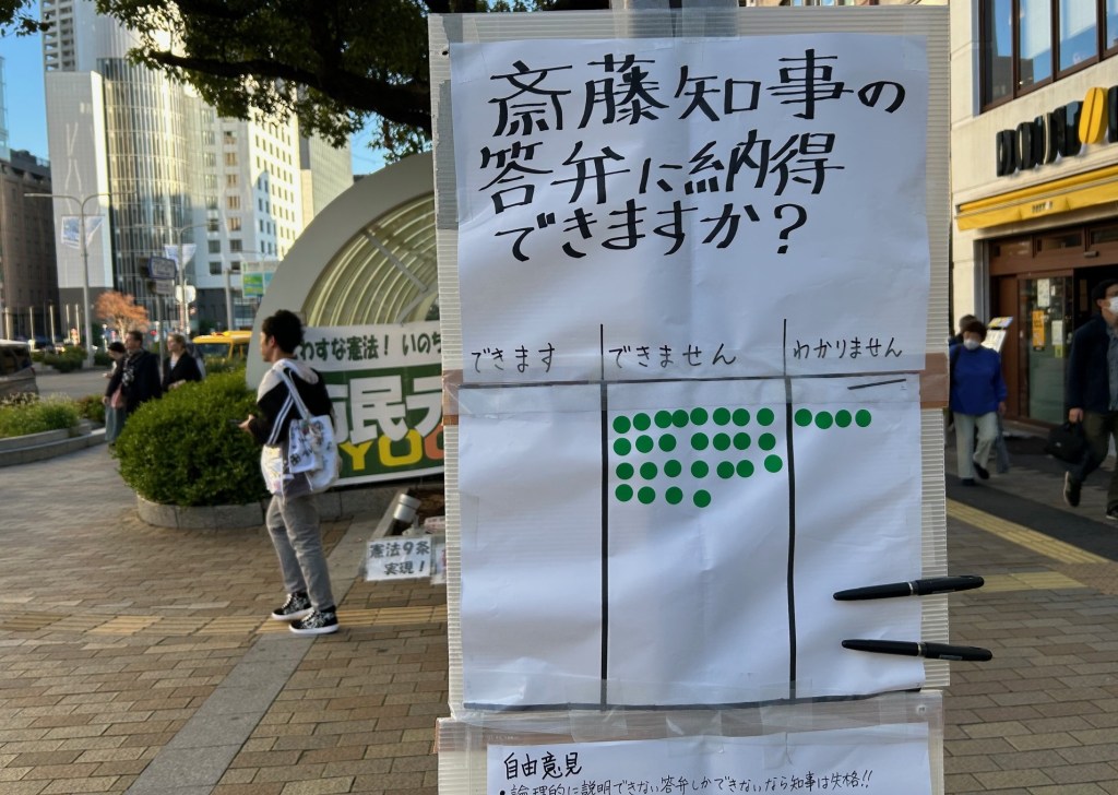 シール投票では、「斎藤知事の答弁に納得できますか」を問い、「できます」が2票、「できません」29票、「わかりません」が4票、計35票。意見の書き込みは、「論理的に説明できないなら知事は失格!さっさと辞めるべきだ!」「なぜ斎藤知事はやめないのか。そういう声が満ちてきた」など。「納得できません」に、投票した人は「早く辞めてほしい」「立花孝志は、なぜ逮捕されないのか」「斎藤知事の答弁は、肝心なところから逃げている」…。
