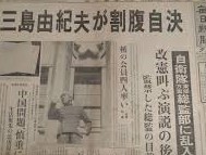 1970年11月25日、私は高校2年生。三島由紀夫の小説も読んだことなく、どういう人物かも知らなかったけれど、ニュースで自衛隊員が演説する三島に野次を飛ばしていたのと、当時は発行されていた『朝日グラフ』が生々しい現場写真を掲載していたのを憶えている。全共闘の「兄ちゃんら」は、「三島に先に越された」とか言っていたし、佐藤栄作・首相(当時)は、「三島は気が狂ったのか」(ママ)と言ったそうだ。