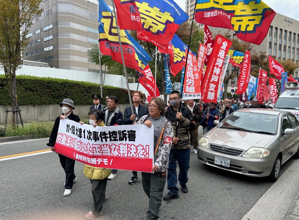 大阪高裁前の公園には多くの労働者、市民が集まった。12時から「裁判所グルグル包囲デモ」を行ない、小集会を開いた。労働組合つぶしの大弾圧を許さない実行委員会の小林勝彦さんは、「コンプライアンスは労働者の命を守るものであり、労働組合として当たり前の活動だ。これを事件とし、罪に問うことは許されない」と訴えた。