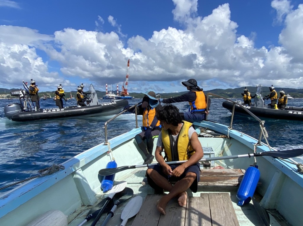 数年前に、私は彼女の監視船の補助員をしたことがあった。その日の大浦湾は荒れ模様であった。海保のGB(ゴムボート)から不当な、監視船確保の警告が発せられたが、その警告に抗うかのように彼女は外洋に向かって全速力で船を発進させた。大波の中、疾走する船上でバランスを崩さないように、私は船首のロープを固く握りしめていた。高い波を通過するたび、身体は宙に浮き、次の瞬間尻が思い切り床にぶち当たった。