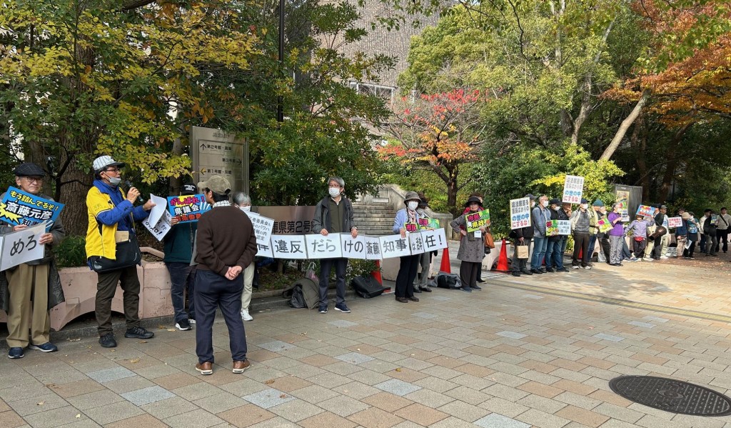 兵庫県議会の初日、市民デモHYОGОは「齋藤知事辞めろ」の兵庫県庁ヒューマンチェーン第6波に取り組み、約60人が県庁前に並んだ(12月2日)。