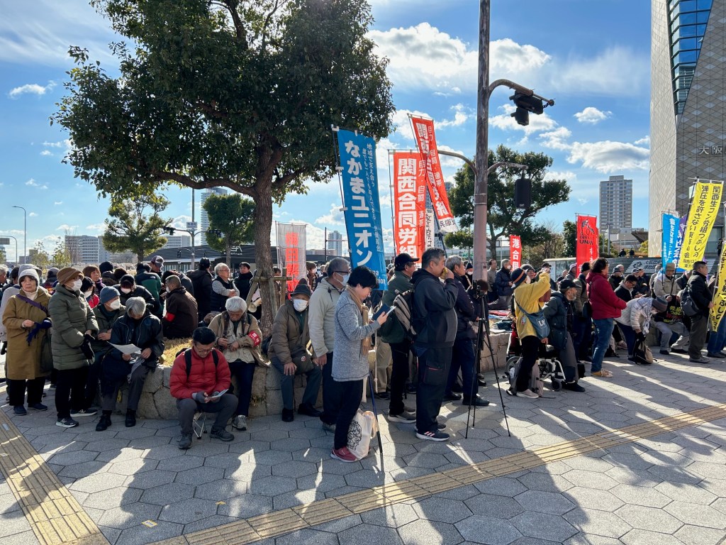 2026元旦、労働組合つぶしの大弾圧を許さない実行委員会が呼びかけ、450名の労働者・市民が集まった(午前10時、大阪府警前)。小林勝彦・反弾圧実行委員会代表が主催者あいさつ。