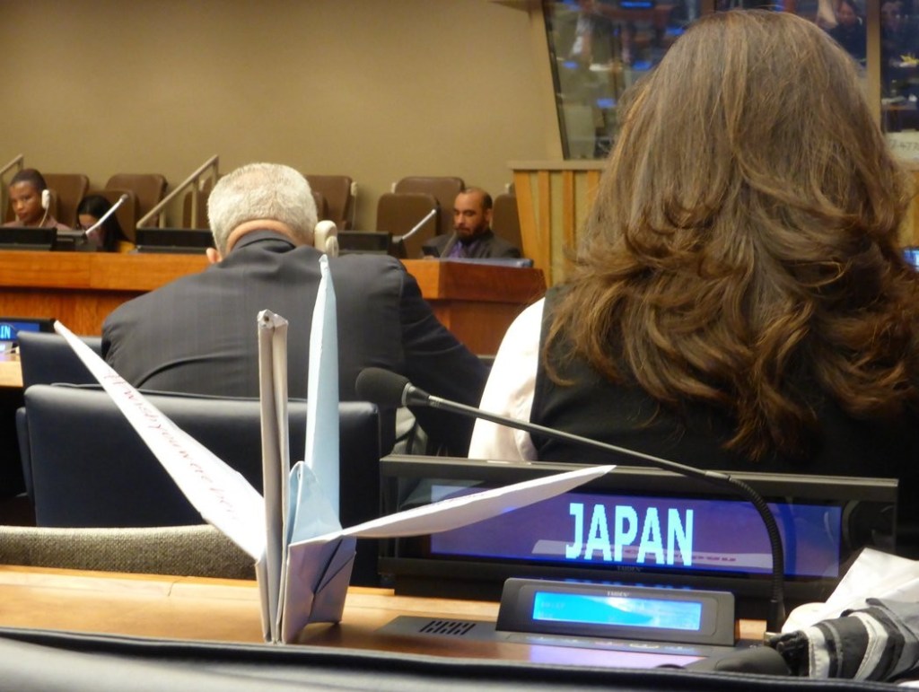 核兵器禁止条約が国連で採択され、2021年1月に発効した。採択から9年となる。条約第1条は、「締約国はいかなる状況においても、『核兵器の…開発、実験、製造、生産、あるいは獲得、保有、貯蔵』を実施しない」と明記している。日本は唯一の「戦争被爆国」でありながら、署名も批准もしていない。締約国会議に、オブザーバーとしても参加しない(折り鶴が置かれた、欠席の日本席=写真)。